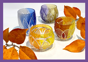 2020年11月12日今回の「出来立て江戸切子」は秋の味覚をテーマにお届けいたします。 旬を迎えた食べ物をイメージした作品達。 ぜひご覧くださいませ。
