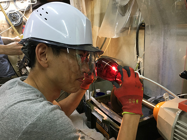 気になり近づいてみると、ヘルメットを被って宙吹き硝子の切断をしていました。