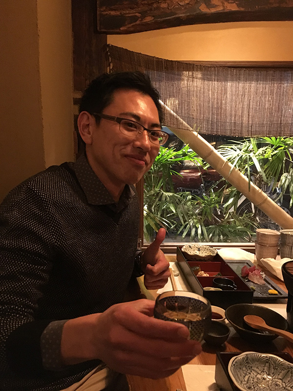 切子のぐい飲みで乾杯の様子です。(話が盛り上がりすぎ、全員での写真撮影を