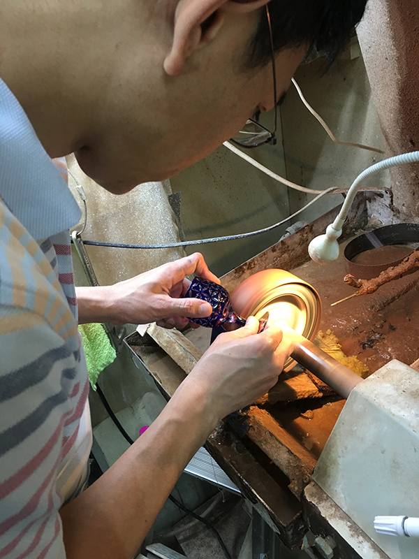 本日は三代目が、ワイングラスのステム(足の部分)についた傷の修理をしていました。