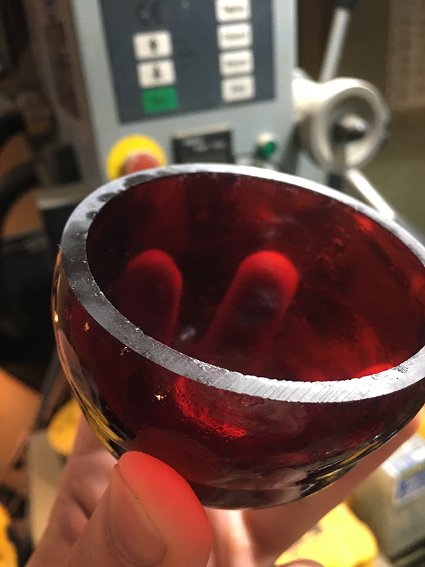 今日は会長が、切断した宙吹きグラスの切断面を滑らかにする「口擦り」をしていました。