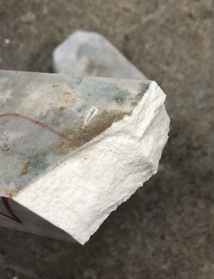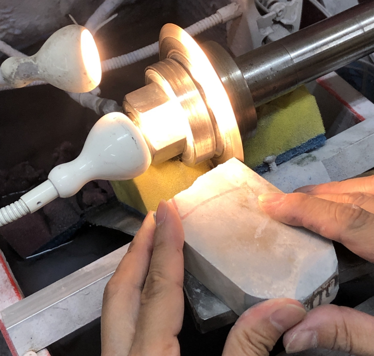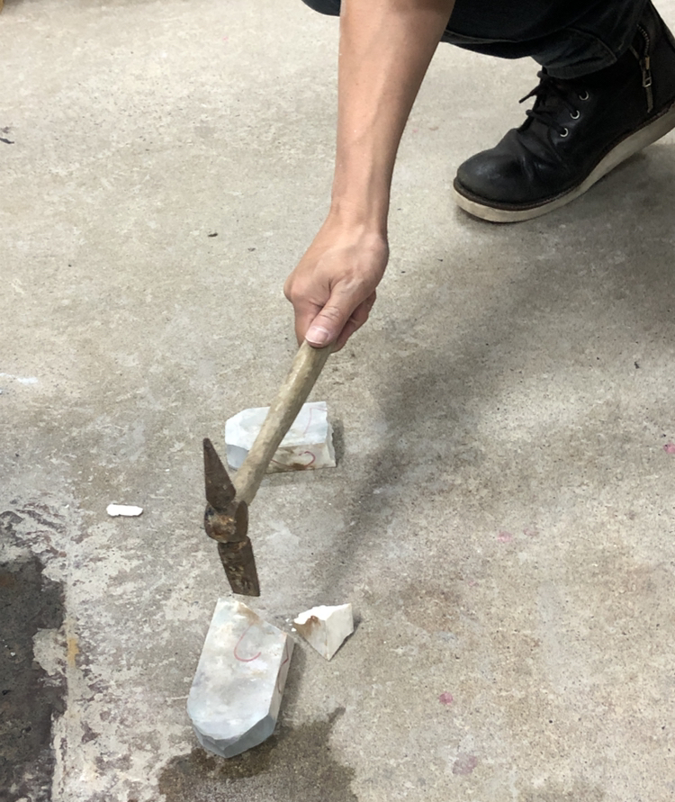 砕いている白いものは「砥石」と言い、硝子を削るダイヤモンドホイールの刃に押し当てて表面を整えたり、切れ味を上げるためのものです。