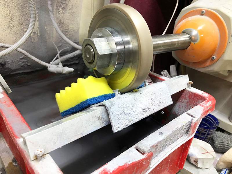 (ガラスを削るときは熱をもたないように刃に水をかけながら作業します)