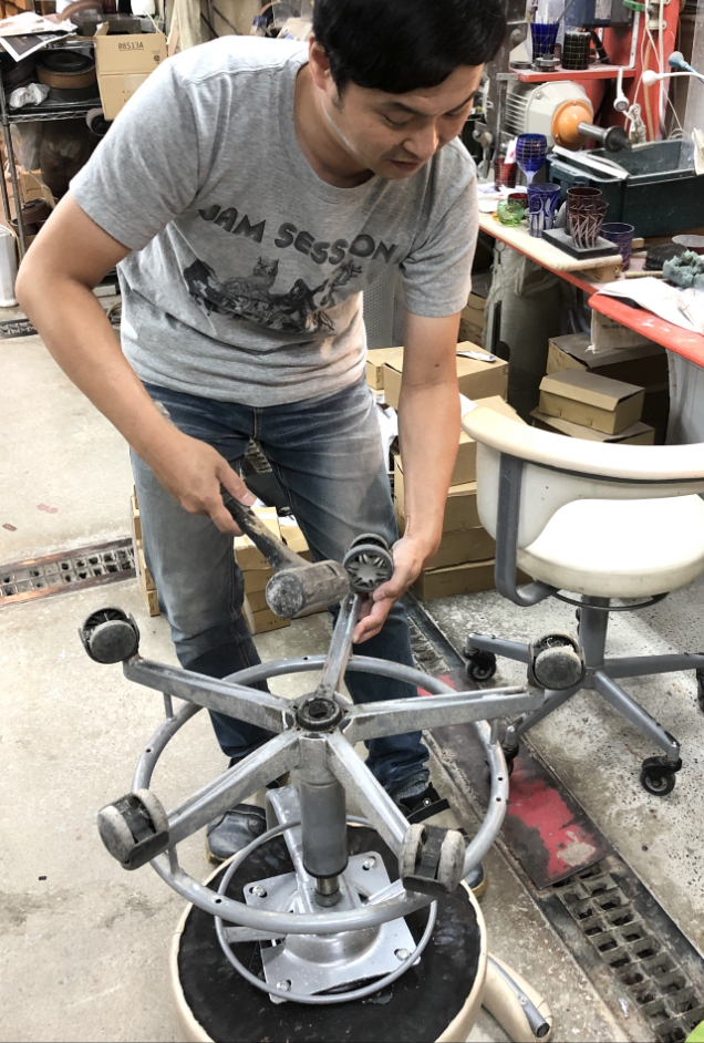 これは椅子の修理をしていまして、壊れたキャスターを外して新しいモノをハンマーで叩いて取付けているところなんですよ。