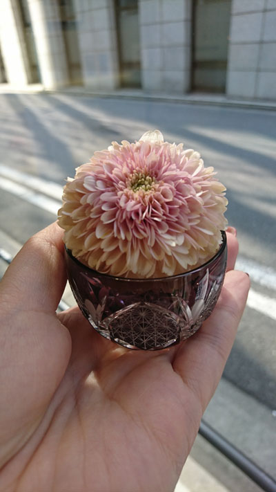 菊のカットが入ったおちょこにお花をのせて菊づくしを楽しんでみました。
