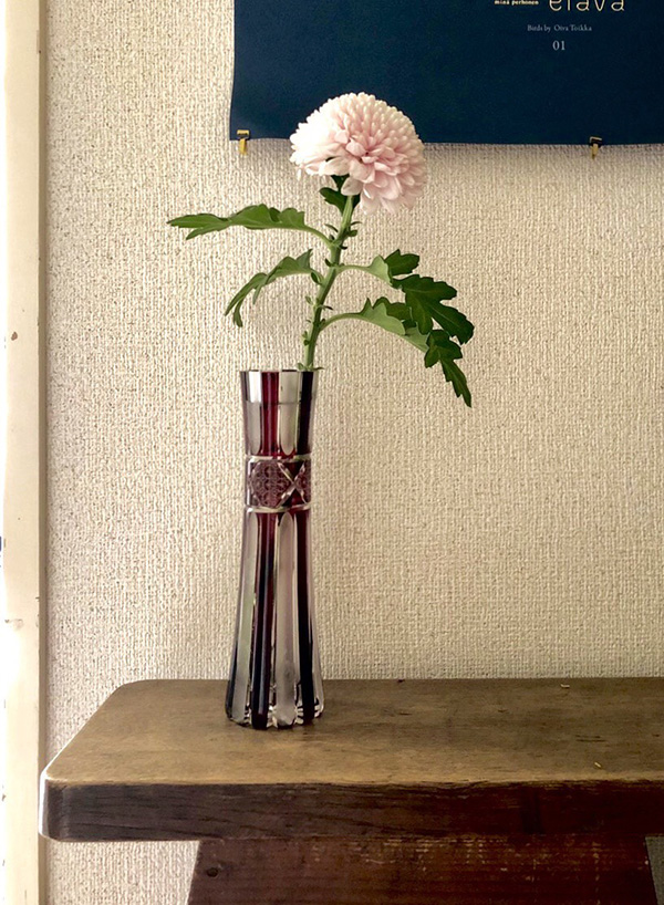 今まで自分の家では一輪挿しを使ったことがなかったのですが、飾るためのスペースを作って置いてみると、しっかり部屋に合っていて、とても良い空間になったように思います。