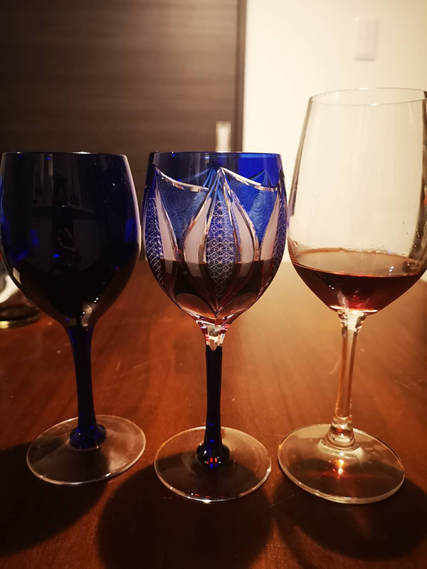 江戸切子のワイングラスは 横から見ると、飲み進める内に模様が浮かび上がってきて 上から覗くと、