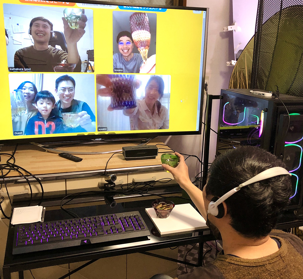 下の写真は、以前スタッフ達でそれぞれマイグラスを使ってリモート飲み会をした時のものです。
