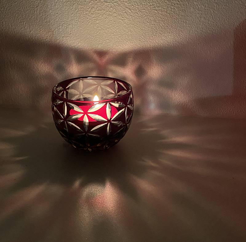 壁の近くに置いてみると、切子の柄が影となり写り込み、